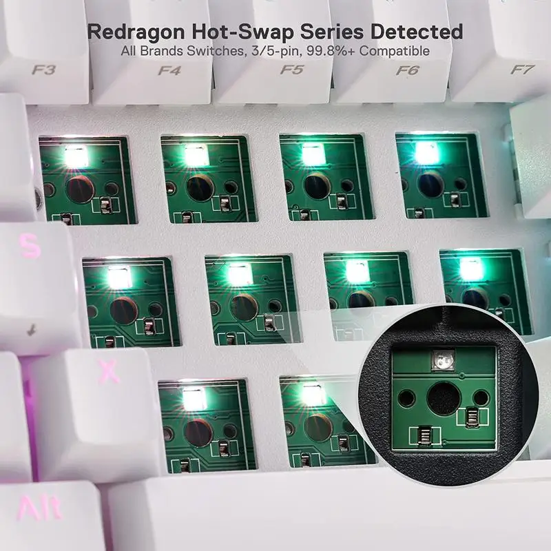 • YES! TRUE HOT-SWAP – The transformative innovation with 99.8%+ switches compatible free-mod hot swappable Redragon keyboard is available now. The unique exclusive structure design of the socket makes the switch mounting easier and less wobbling.